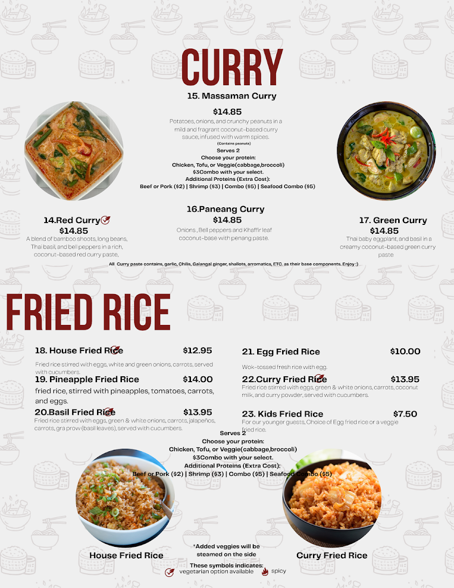 House fried rice made with garlic red curry chili paste, mixed with peas carrots, onion, egg, jalapeño and Thai basil.